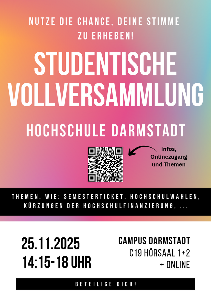 Die Studentische Vollversammlung ist das wichtigste Treffen für alle Studierenden, um gemeinsam Anliegen, Fragen und Probleme zu besprechen, die uns als Gemeinschaft betreffen. Hier können wir direkt Einfluss nehmen und uns Gehör verschaffen – eine Chance, die wir nutzen sollten!